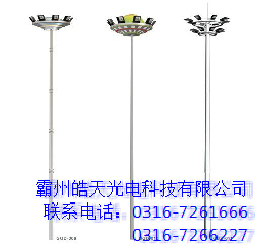 高桿燈一般指15米以上鋼制柱型燈桿和大功率組合式燈架構(gòu)成的新型照明裝置。高桿燈由燈頭、內(nèi)部燈具電氣、桿體及基礎(chǔ)部分組成。燈頭造型可根據(jù)用戶要求、周圍環(huán)境、照明需要具體而定;內(nèi)部燈具多由泛光燈和投光燈組成,光源采用NG400高壓鈉燈,照明半徑達(dá)60米。桿體一般為圓柱型獨體結(jié)構(gòu),用鋼板卷制而成,高度為25—40米以上鋼制柱型燈桿和大功率組合式燈架構(gòu)成的新型照明裝置。